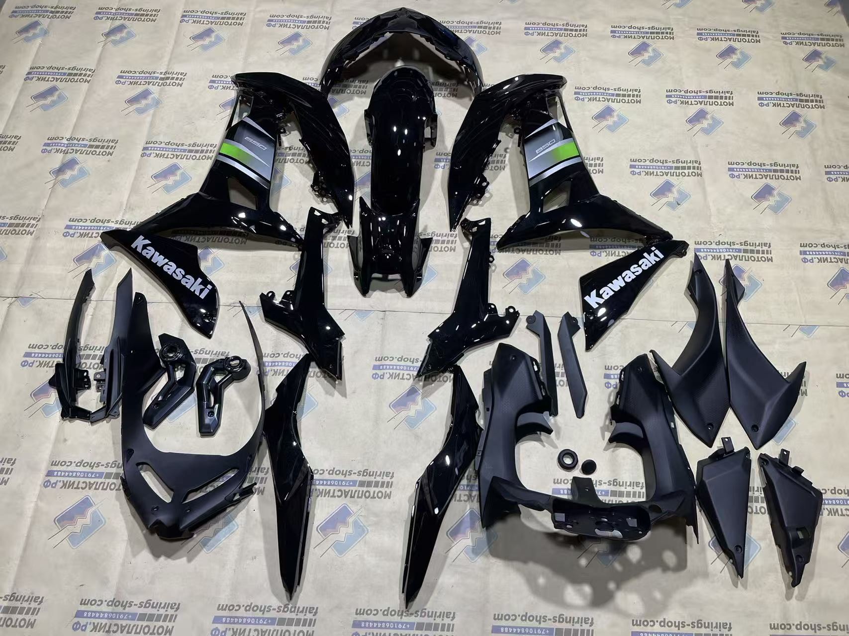 • ㋛ В данный комплект пластика для мотоцикла Kawasaki Ninja 650 2017-2019 входят абсолютно все детали пластиковых элементов облицовки мотоцикла: передний пластик, боковой пластик, переднее крыло, пластик хвоста, накладки воздуховодов, внутренний пластик обтекателя. Точную комплектацию уточняйте, пожалуйста, у менеджеров магазина.
